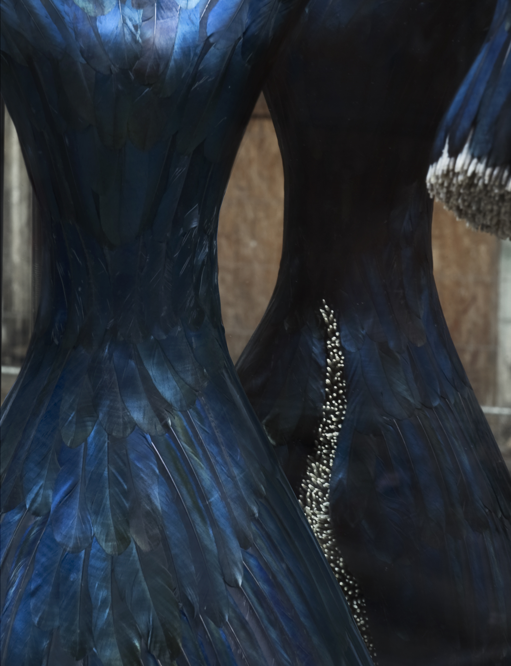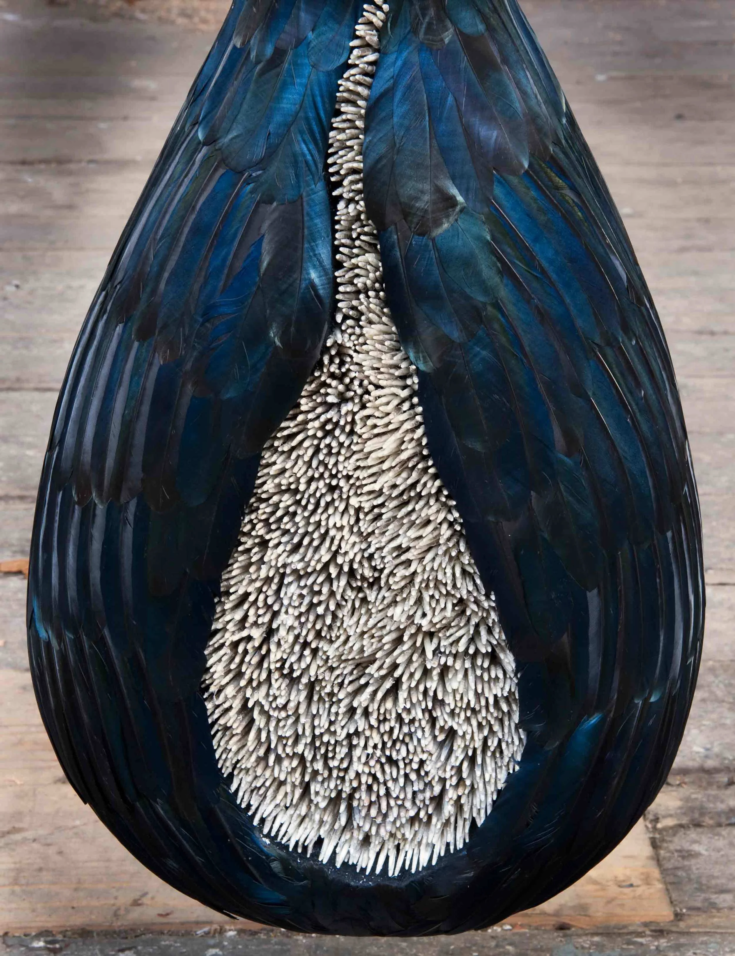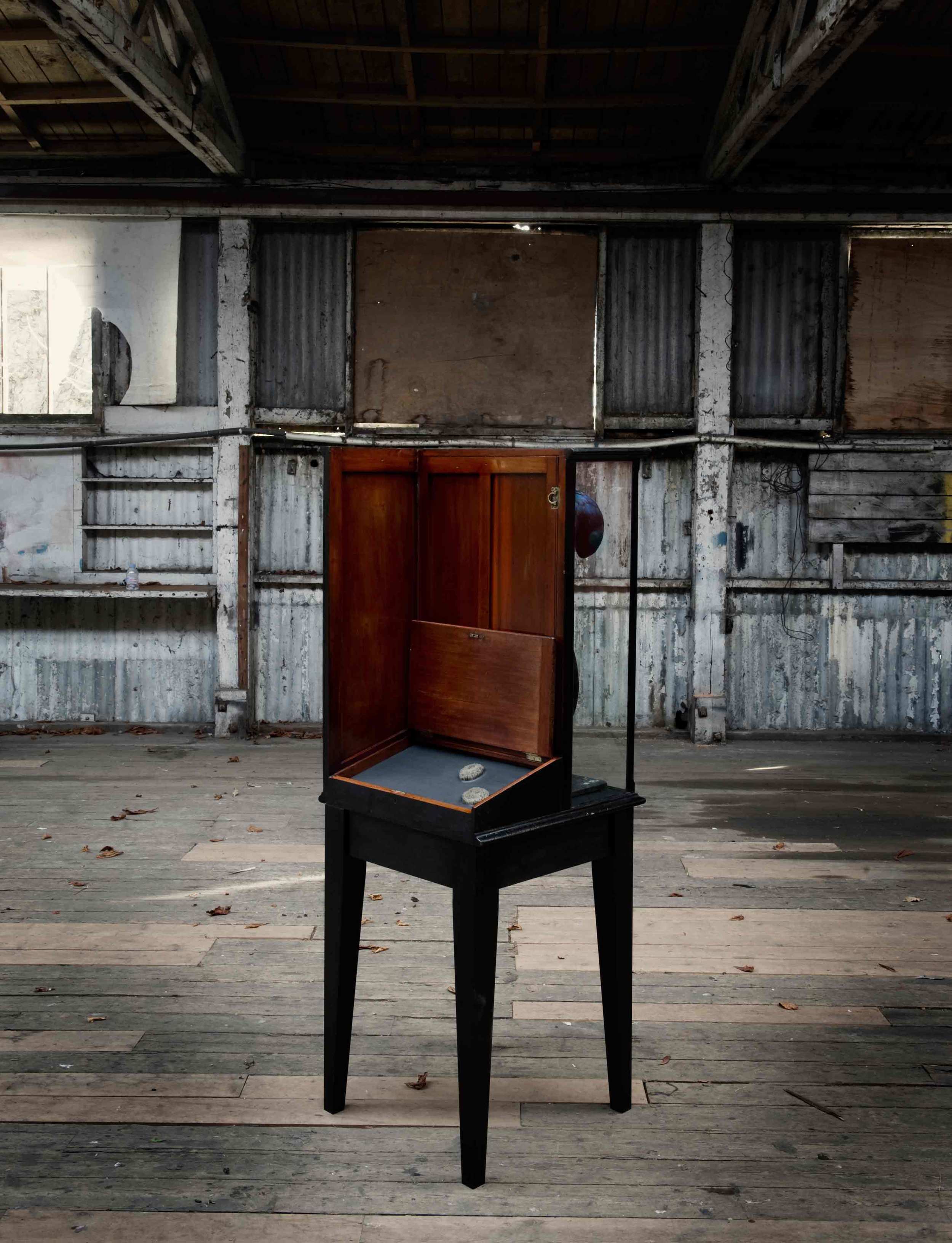 Mixed media with magpie feathers in antique cabinet