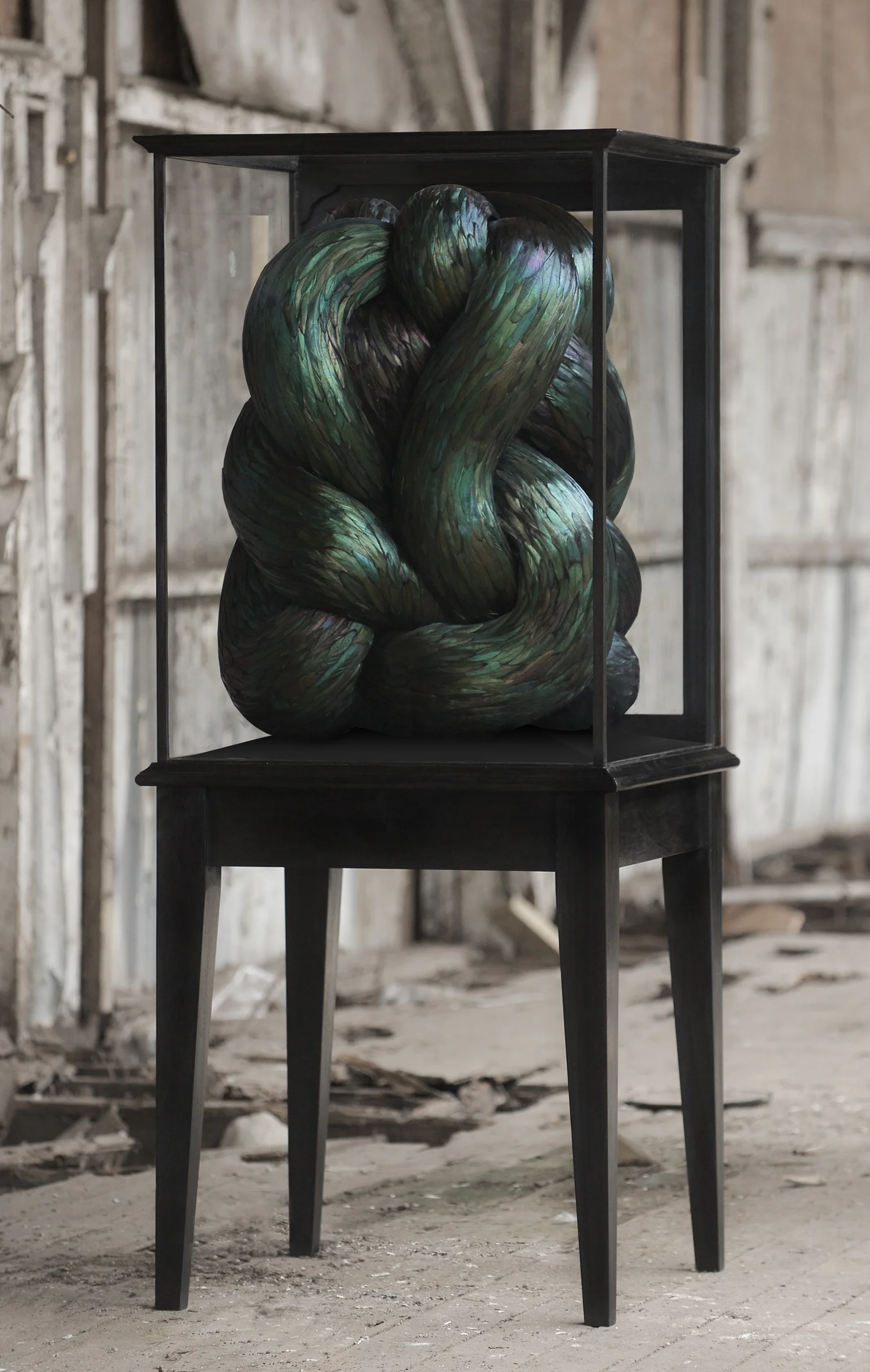 Mixed media with rooster feathers in antique cabinet