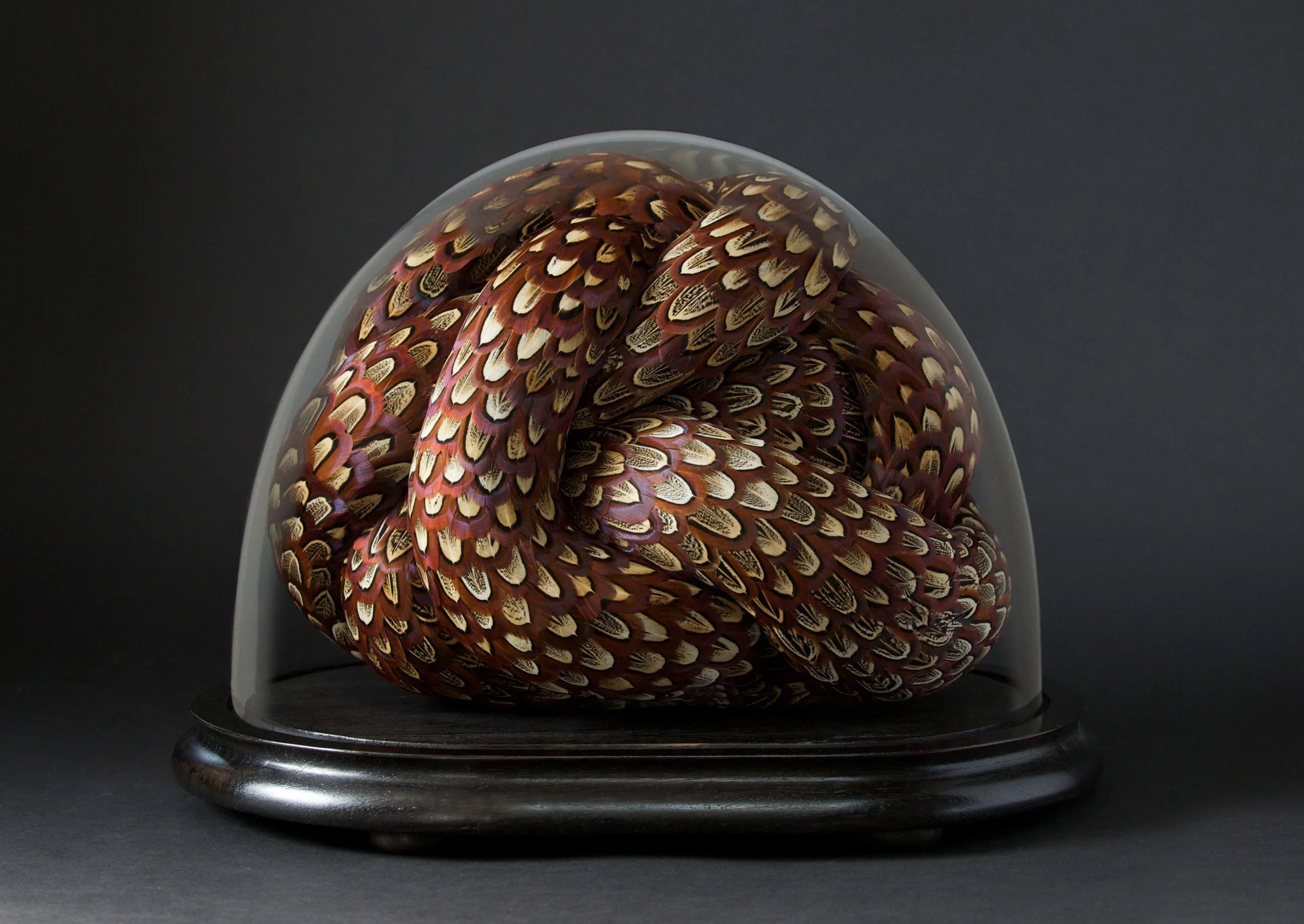 Mixed media with pheasant feathers in antique dome32 x 42 x 29 cm