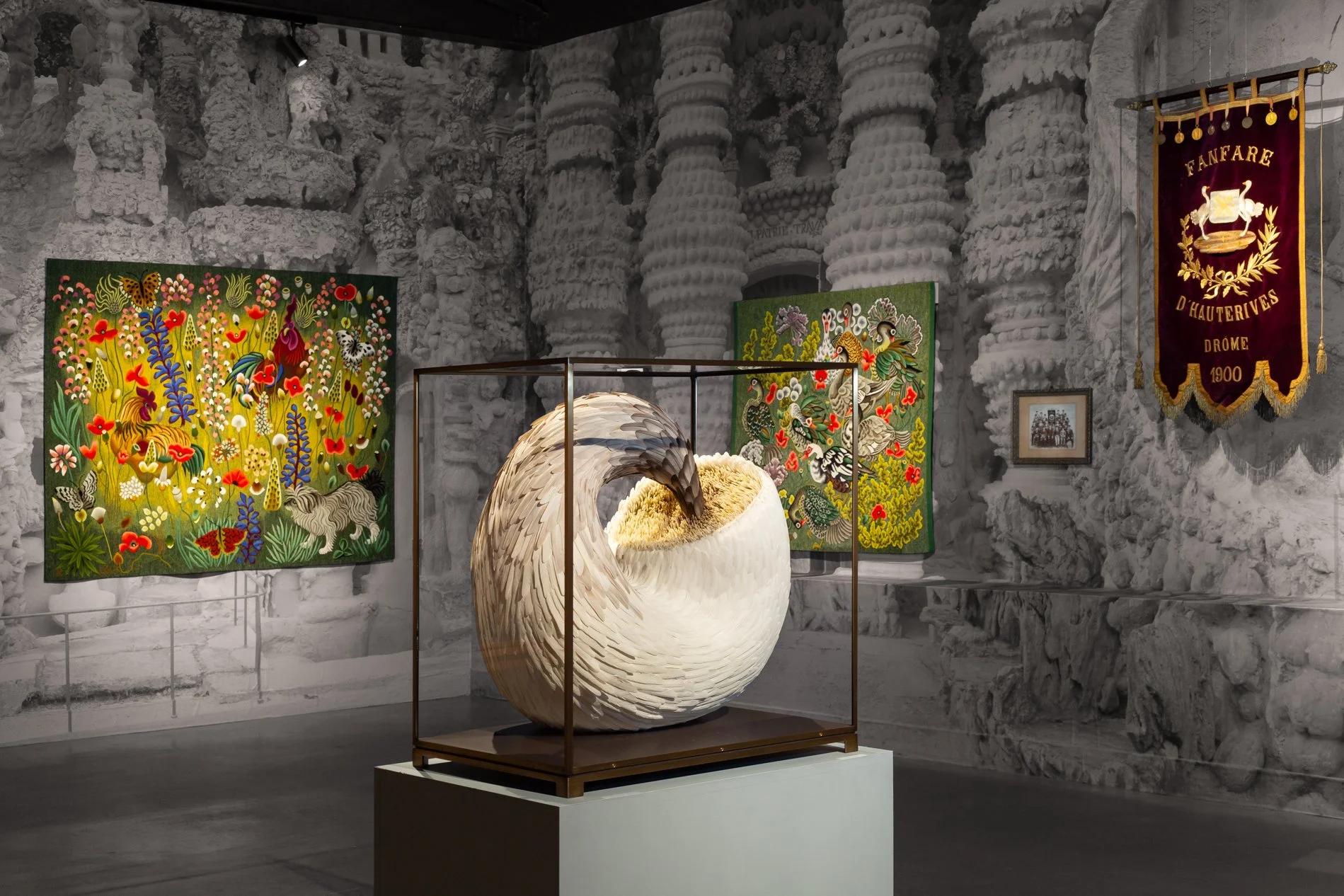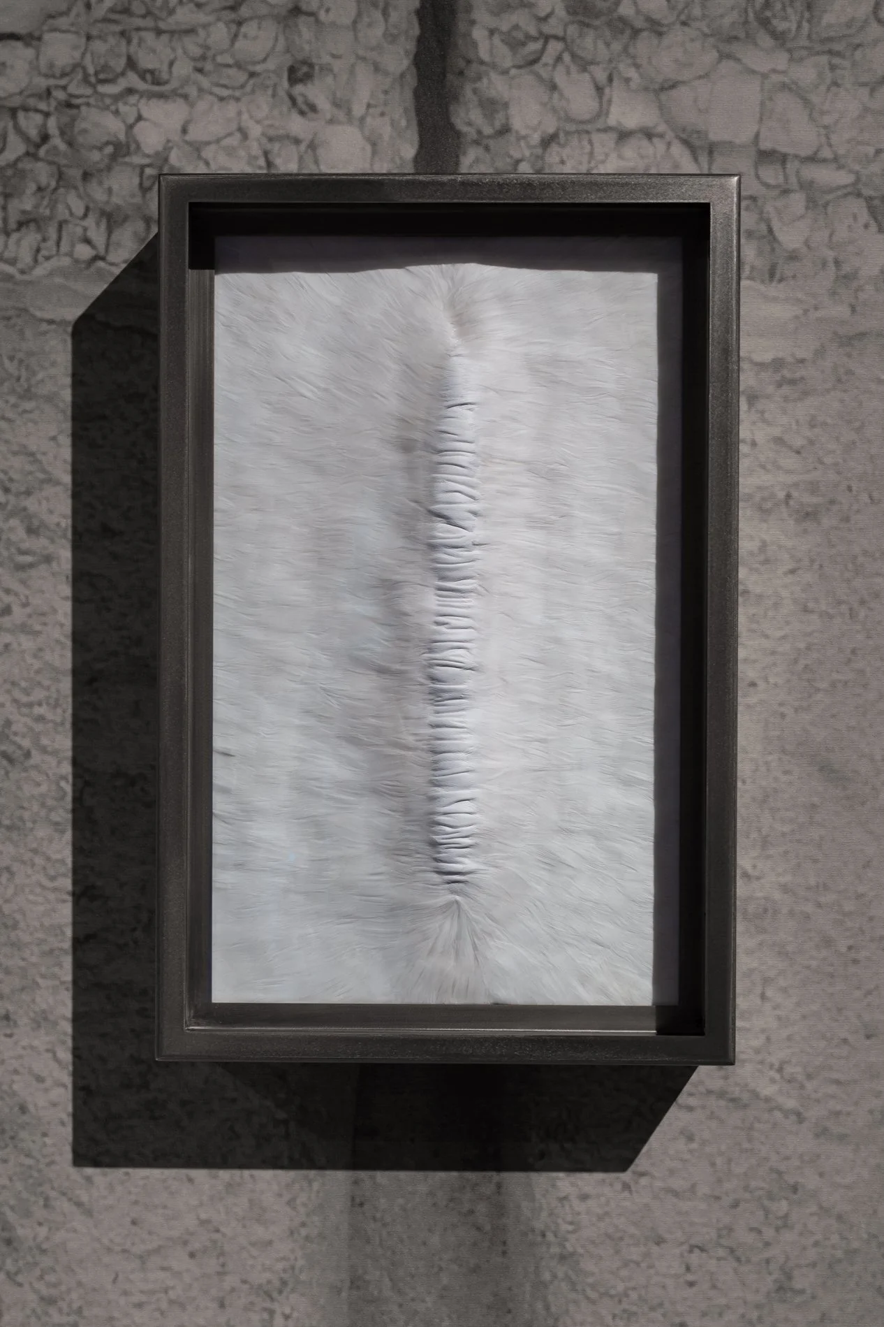 Integral to the confined works, their enclosures do two things. First, they prevent us from touching, from engaging — feathers and fingers forever forbidden. MccGwire explains, “It’s about mystery. They’re often behind glass so that no one can ever touch them and find out what they’re like. They ought not to be touched. That’s part of the work for me.” And second, the vitrines are disturbingly small — the work within is tight and breathless, unambiguously dead.