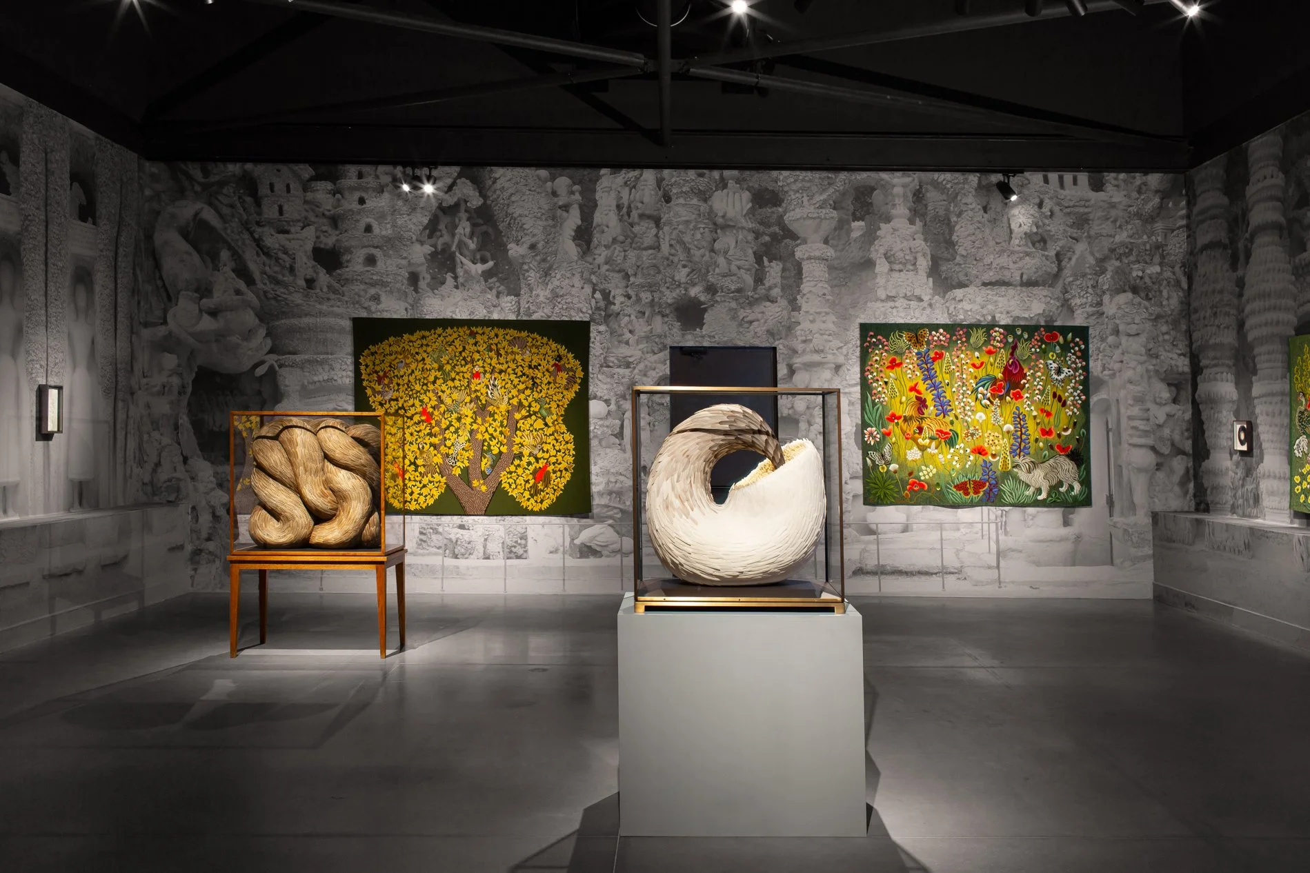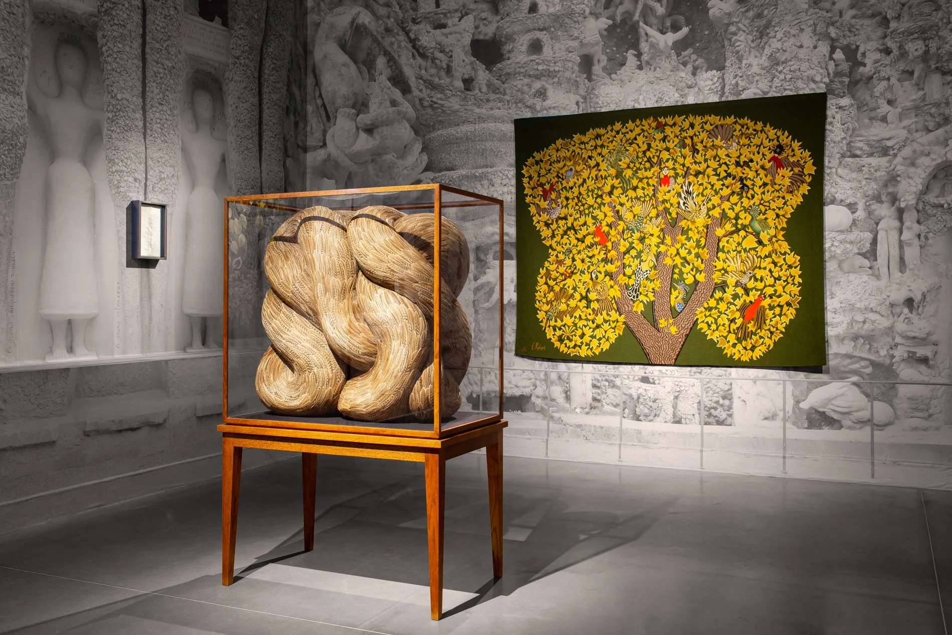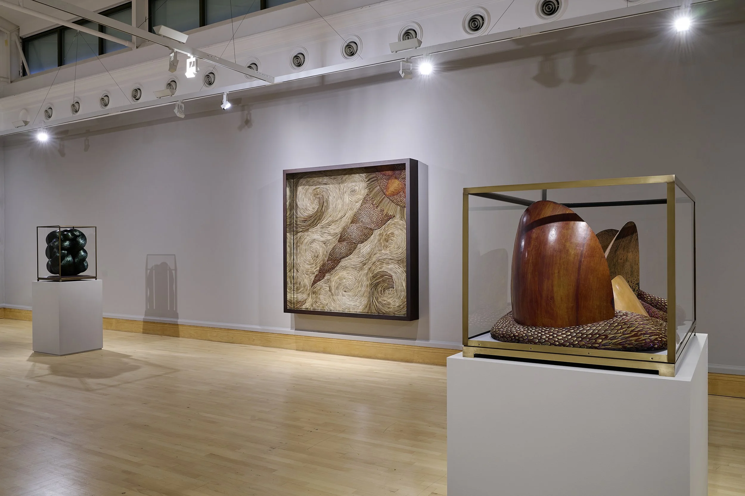Underlying forms oscillate between figurative allusion and a more fluid resonance. There is a sense of musculature beneath the concealing feathered carapace amplifying that key element of ambiguity that is reflected in multiple strands of her work. Notable among these are the confined, constrained constructions, usually within cabinets or domes, that project a rampant sensuality and naked eroticism.