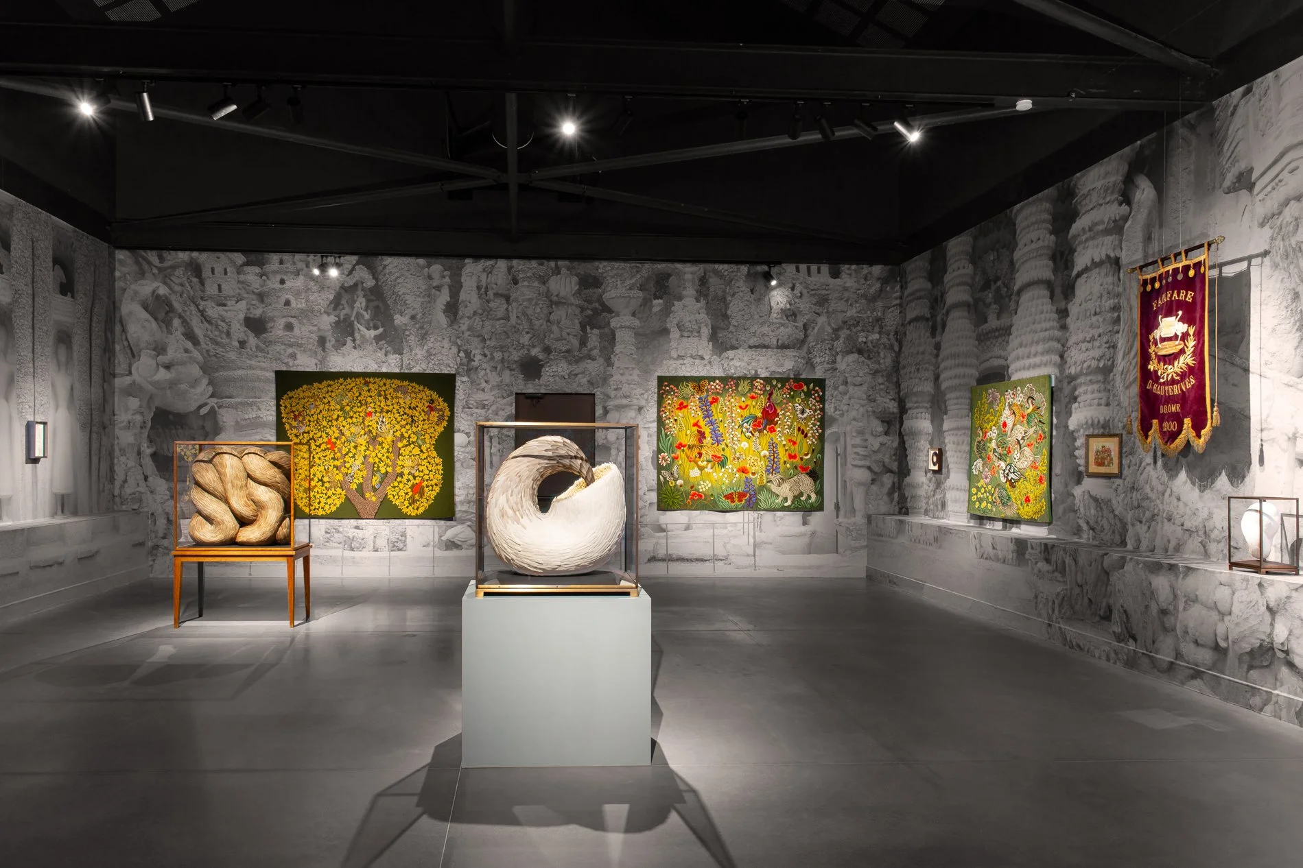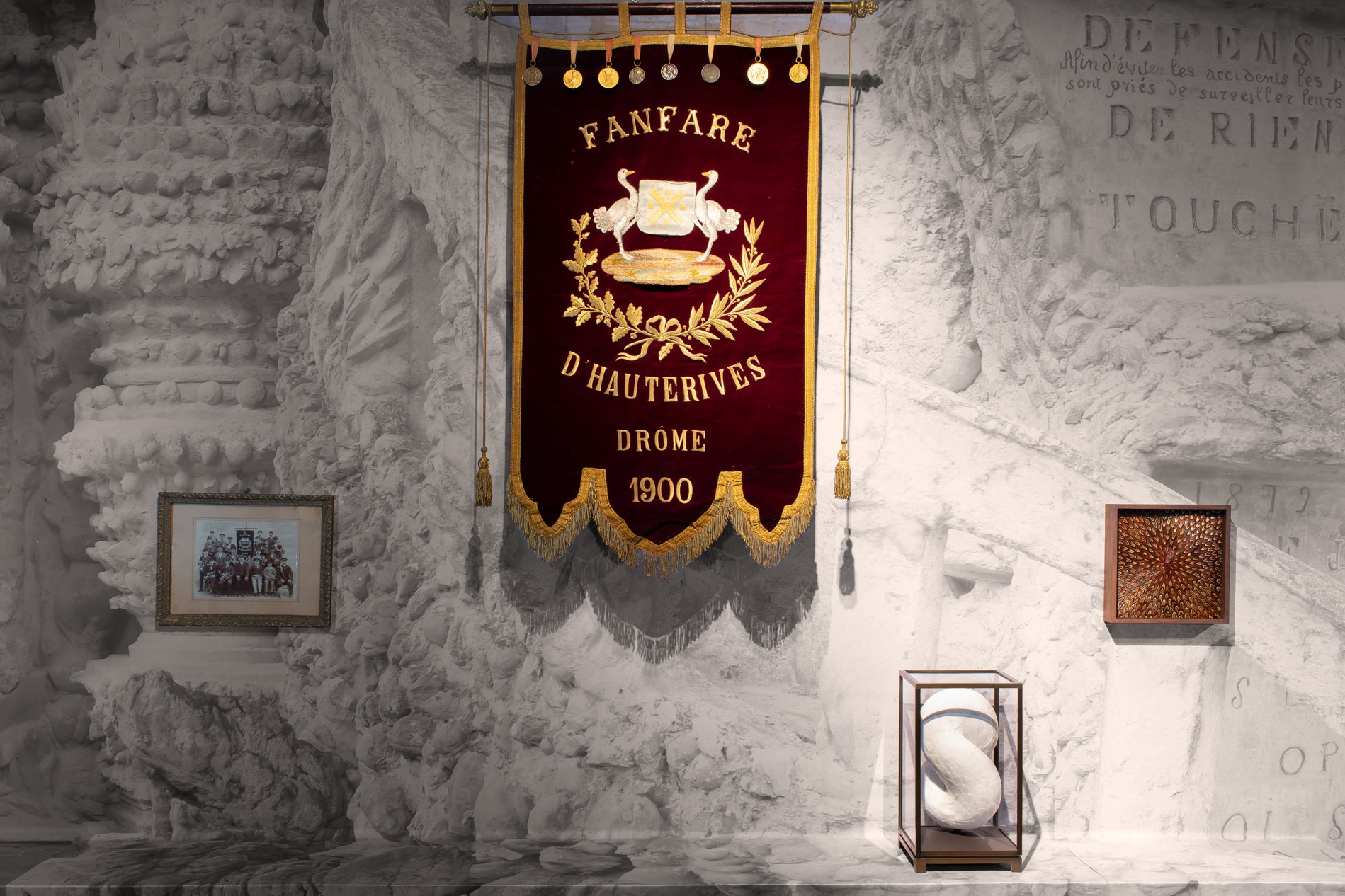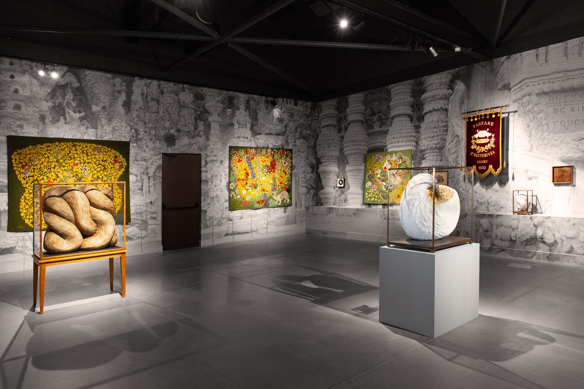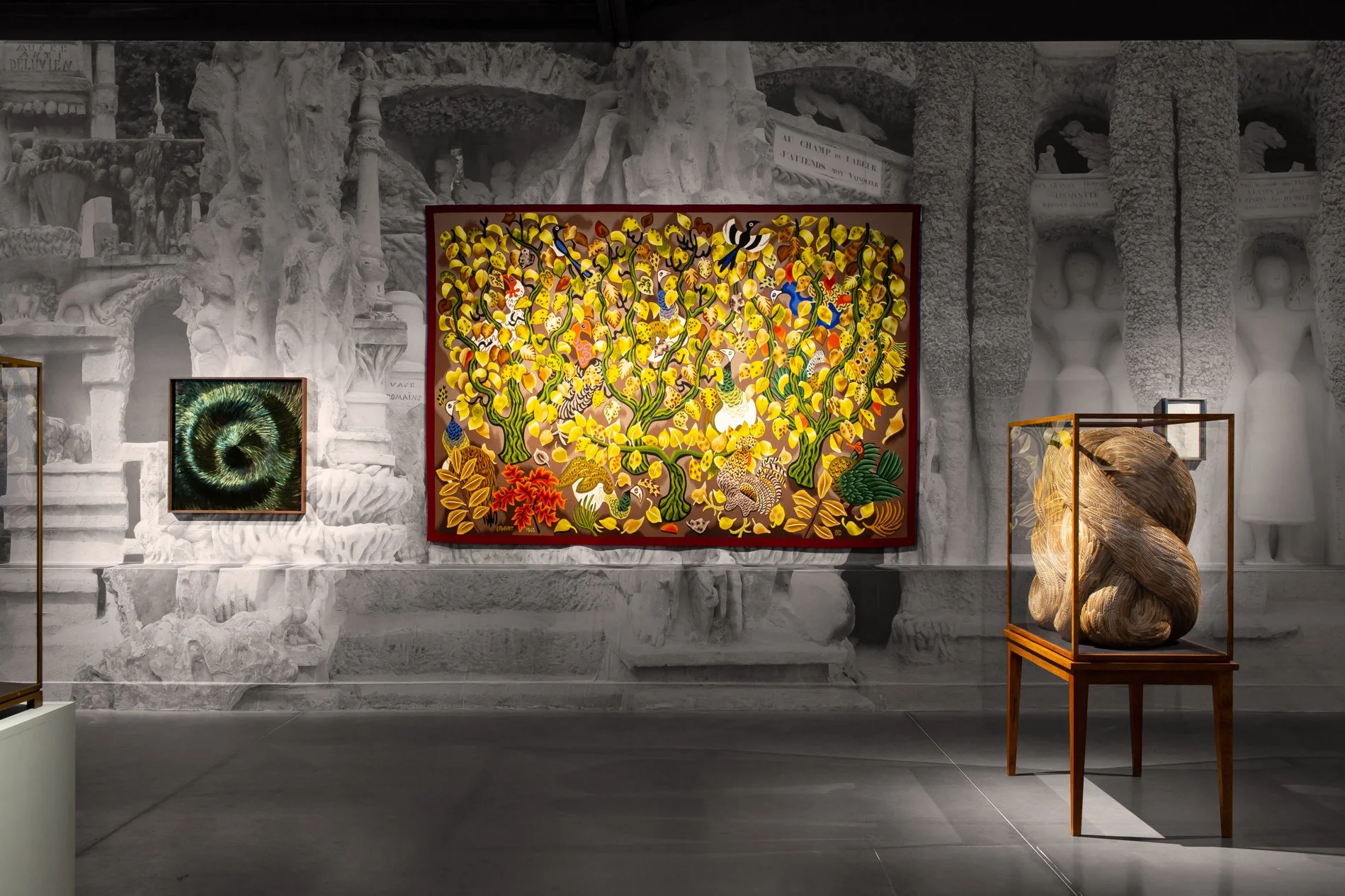 Underlying forms oscillate between figurative allusion and a more fluid resonance. There is a sense of musculature beneath the concealing feathered carapace amplifying that key element of ambiguity that is reflected in multiple strands of her work. Notable among these are the confined, constrained constructions, usually within cabinets or domes, that project a rampant sensuality and naked eroticism.