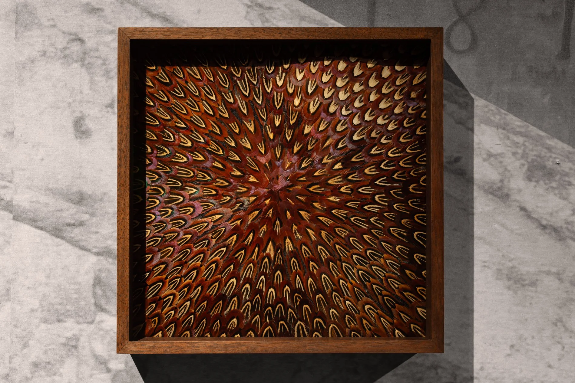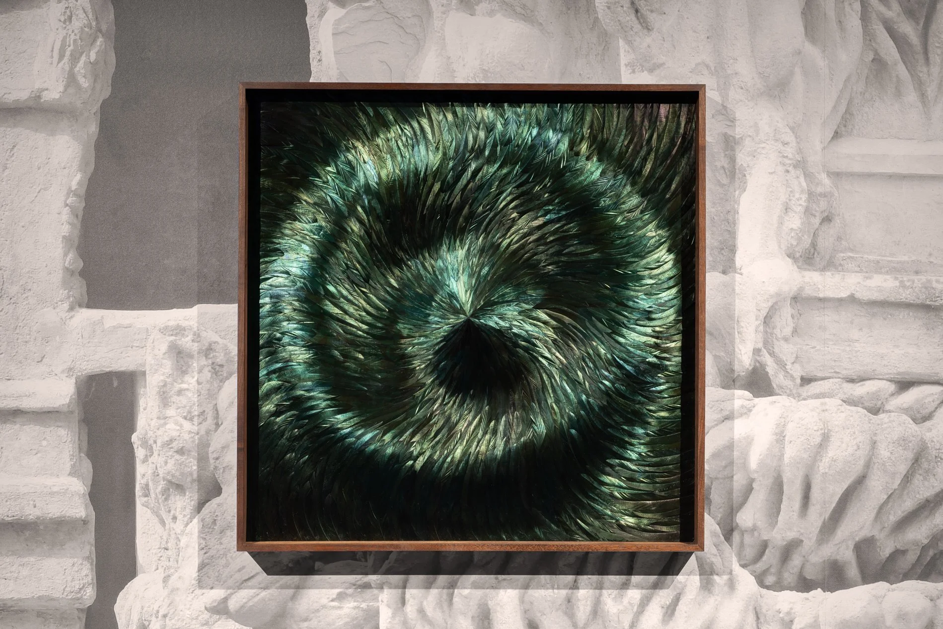 Arranged in waves and torrents, some works remind us of the hidden power of the sea, its whirlpools and maelstroms. MccGwire alludes to this, “They’ll see the beauty and rhythmic energy of the feathers’ patterning, almost like the surface of the sea, but also be aware of a sense of turbulence beneath”.