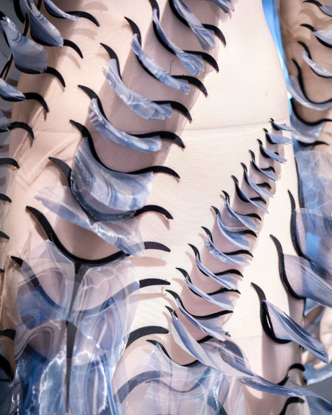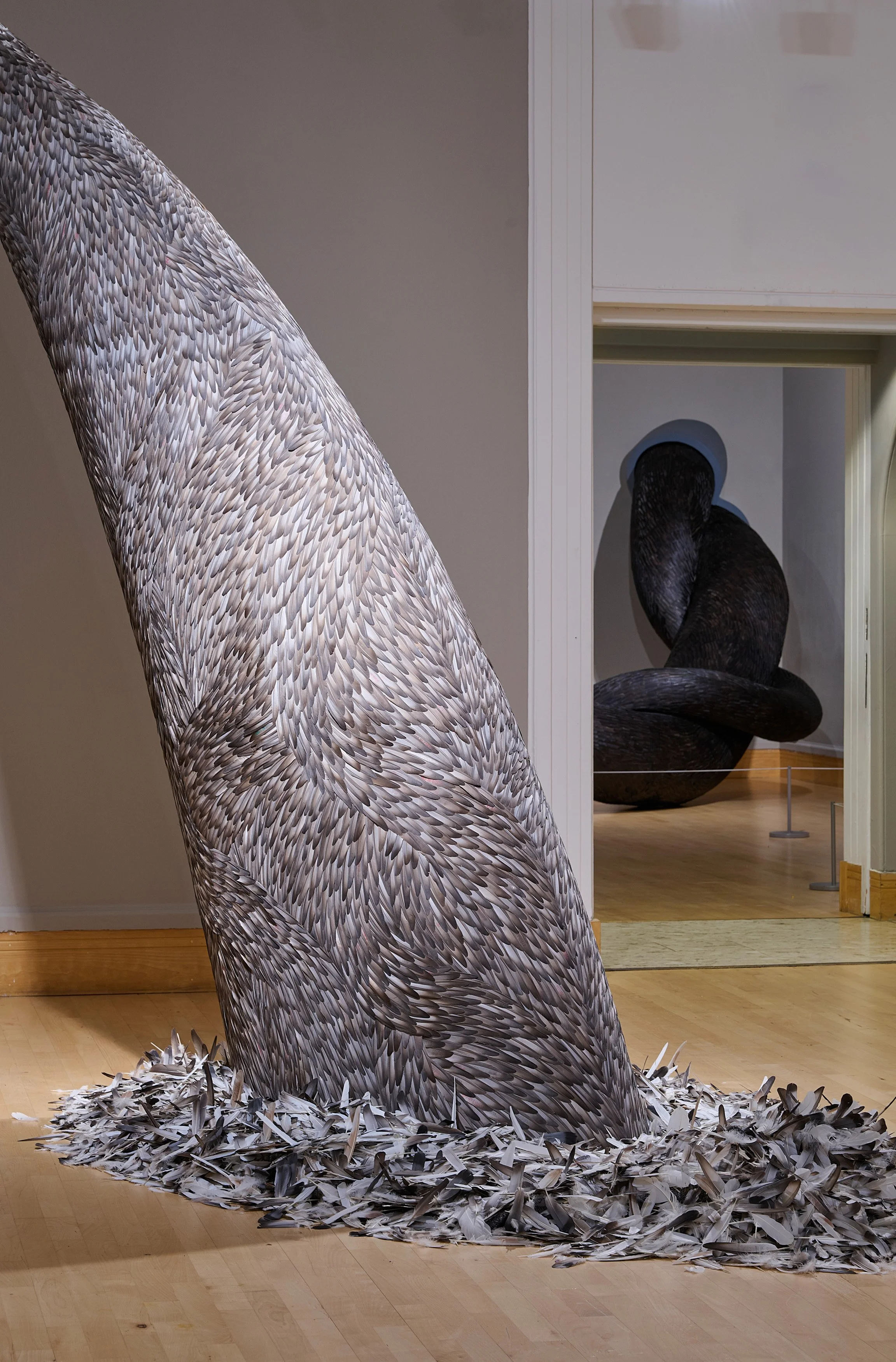 MccGwire’s work has almost no sculptural antecedents — her biomorphic forms are constructed in a complex craft-based ritual. Working on her barge, she creates solid sculptural forms, painstakingly covered with selected feathers, attached one by one in a repetitive process, to almost mimic the close-packed arrangement of feathers on a wing or the scales of a fish or snake. Hairs, scales and feathers are related—all evolved from similar structures, for example bird’s feathers arose from dinosaur scales. MccGwire is aware of these evolutionary origins when she says, “I like the way birds link us with our ancient ancestors.”