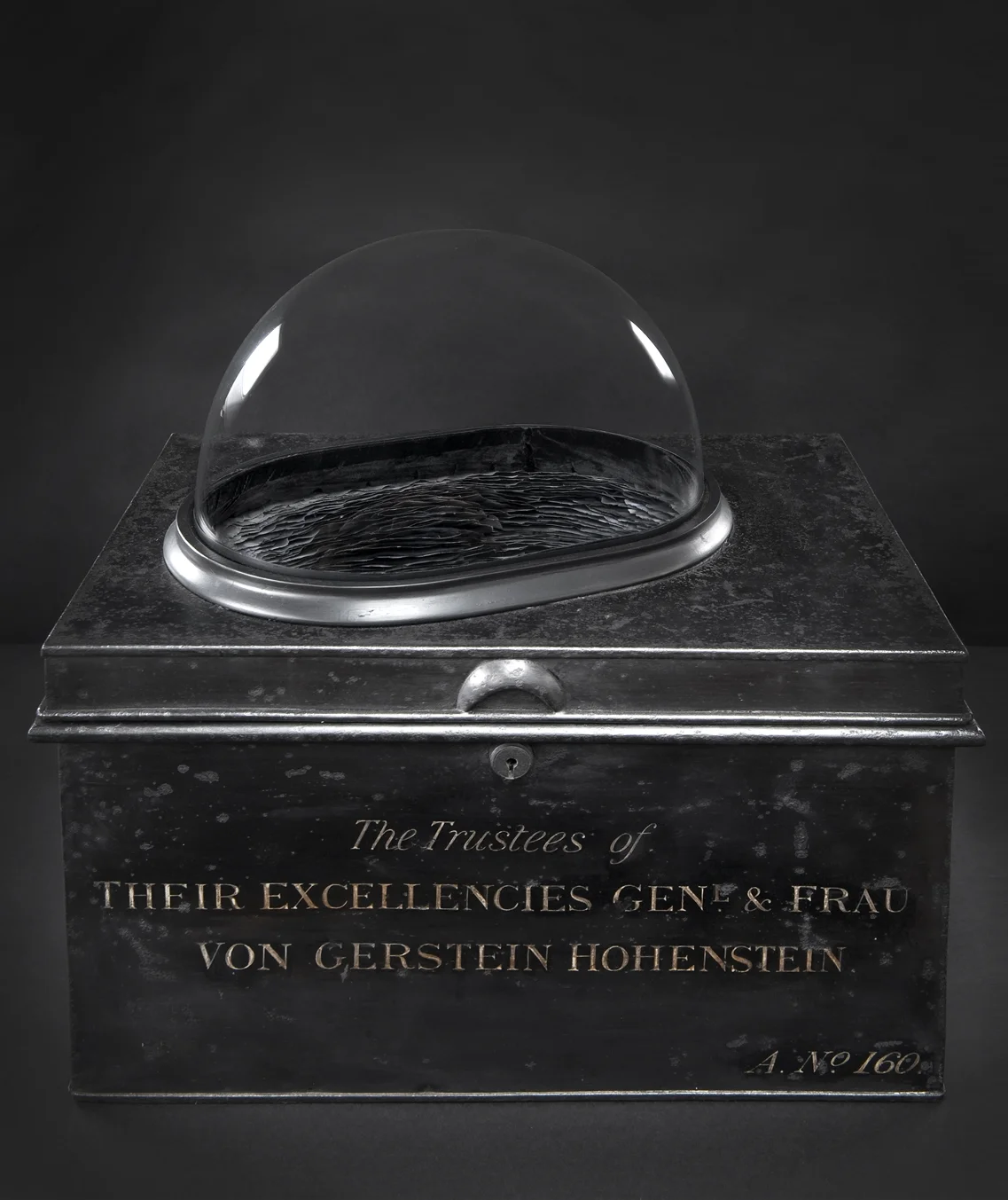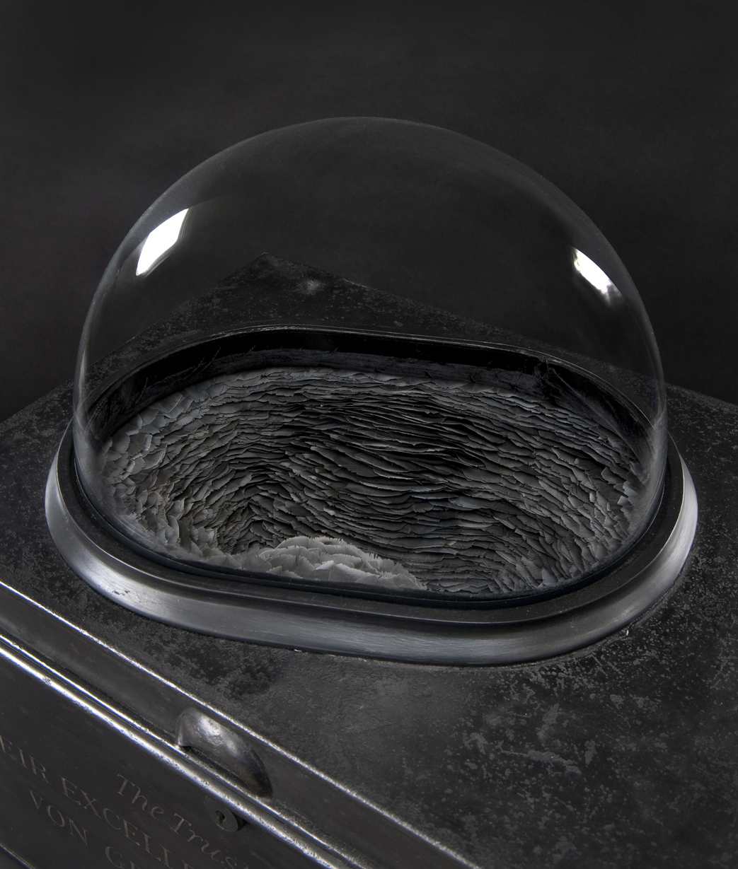 Mixed media with pigeon tail feathers, antique metal trunk and glass dome