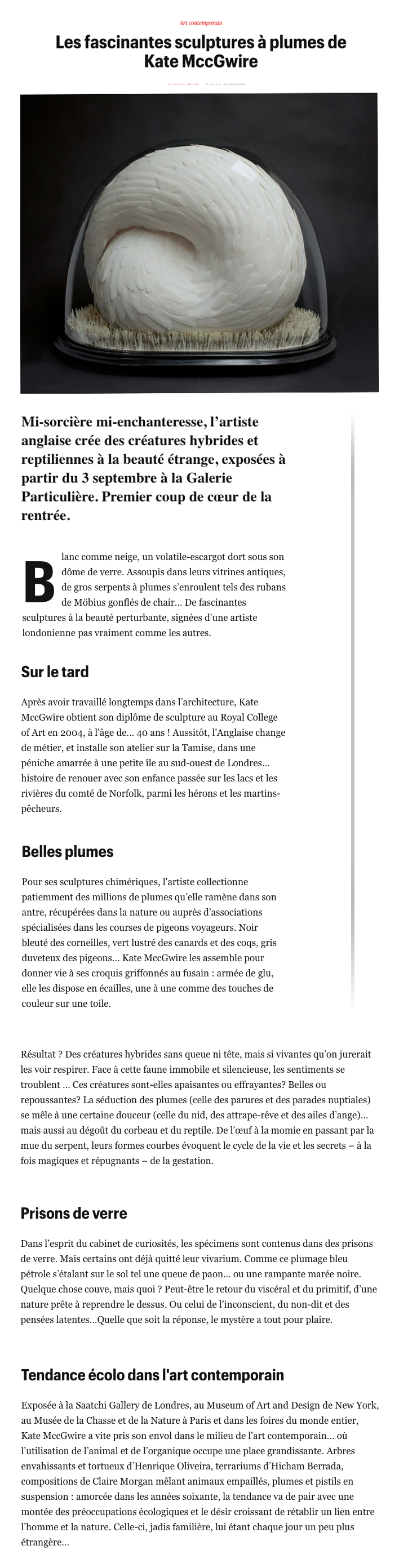 Les fascinantes sculptures à plumes de Kate MccGwire | Joséphine Bindé | Télérama | 30 August 2016 | Click here to view live article.